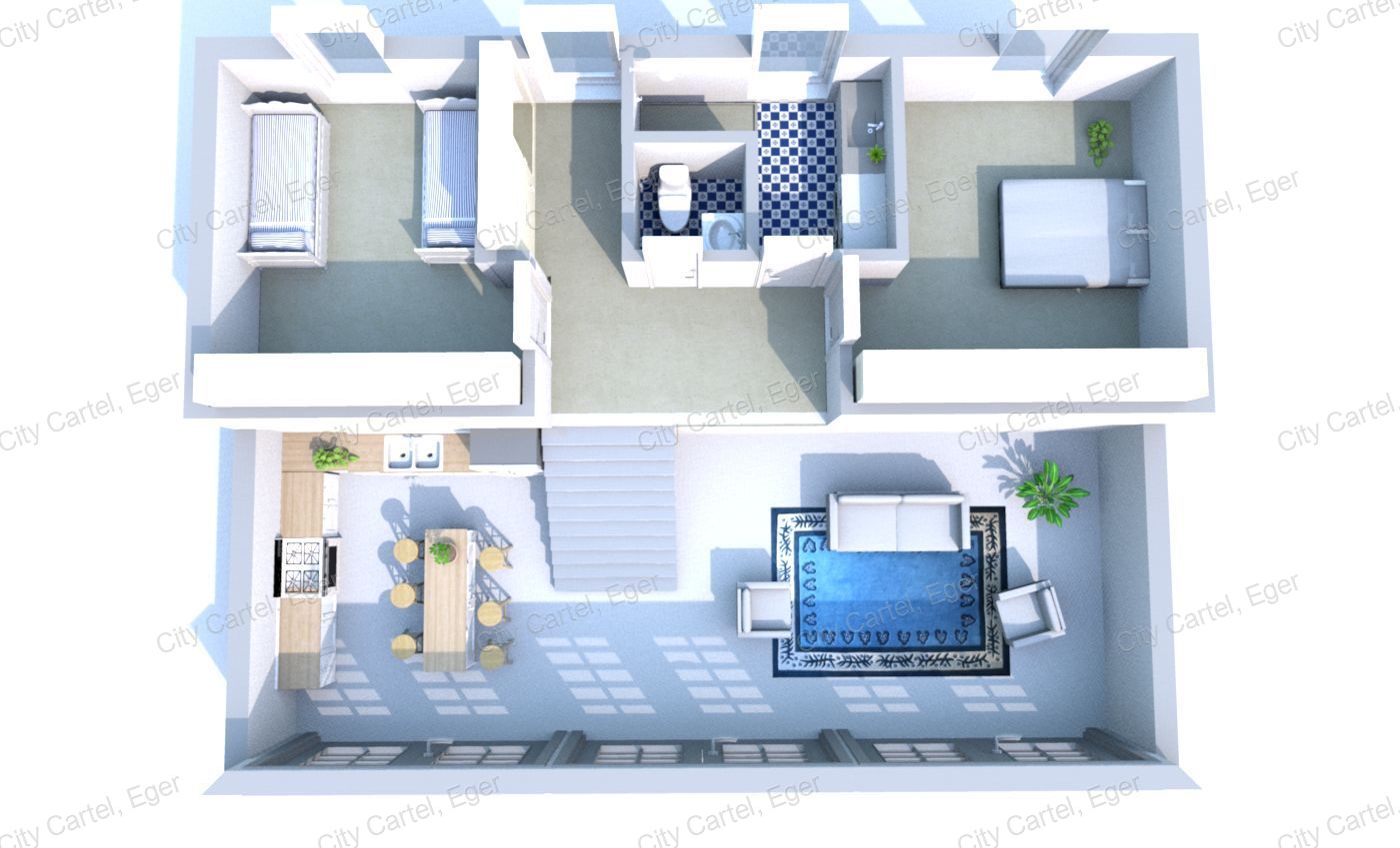 - a lenti szitn egybenyitott nappali, konyha, étkező együttesen 52 nm-